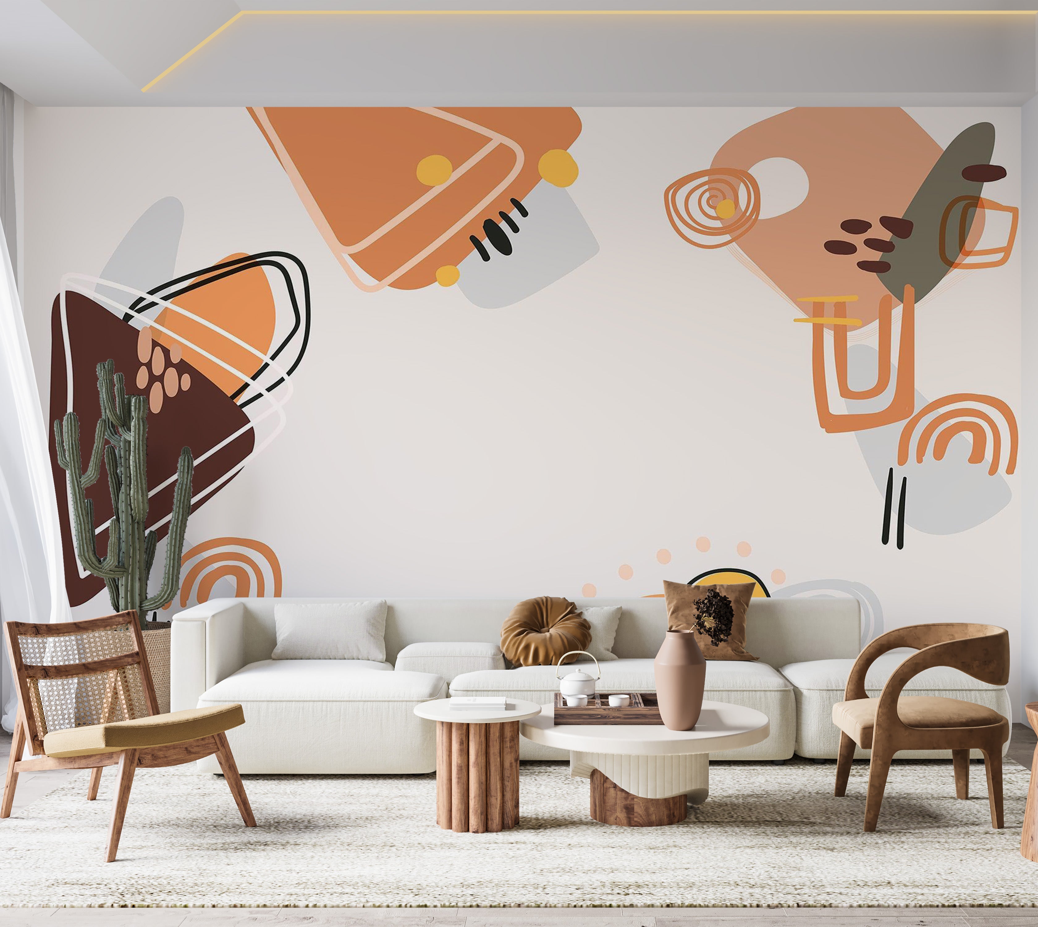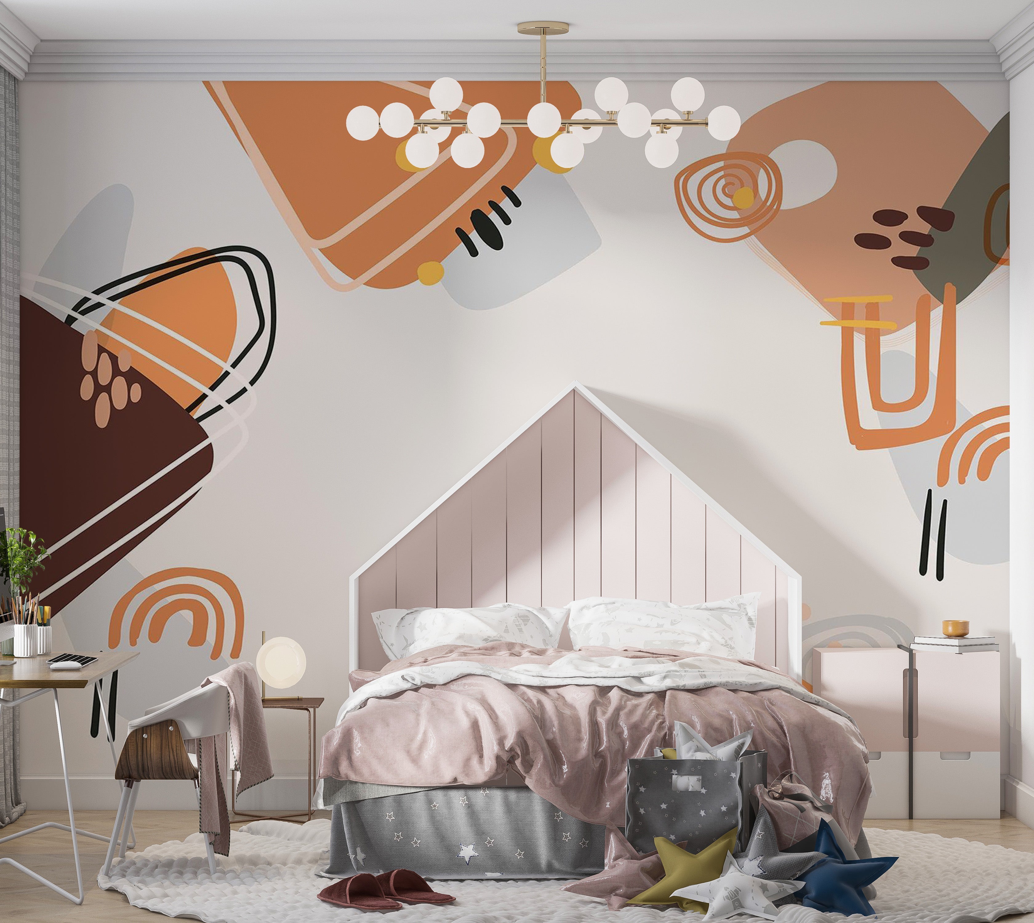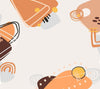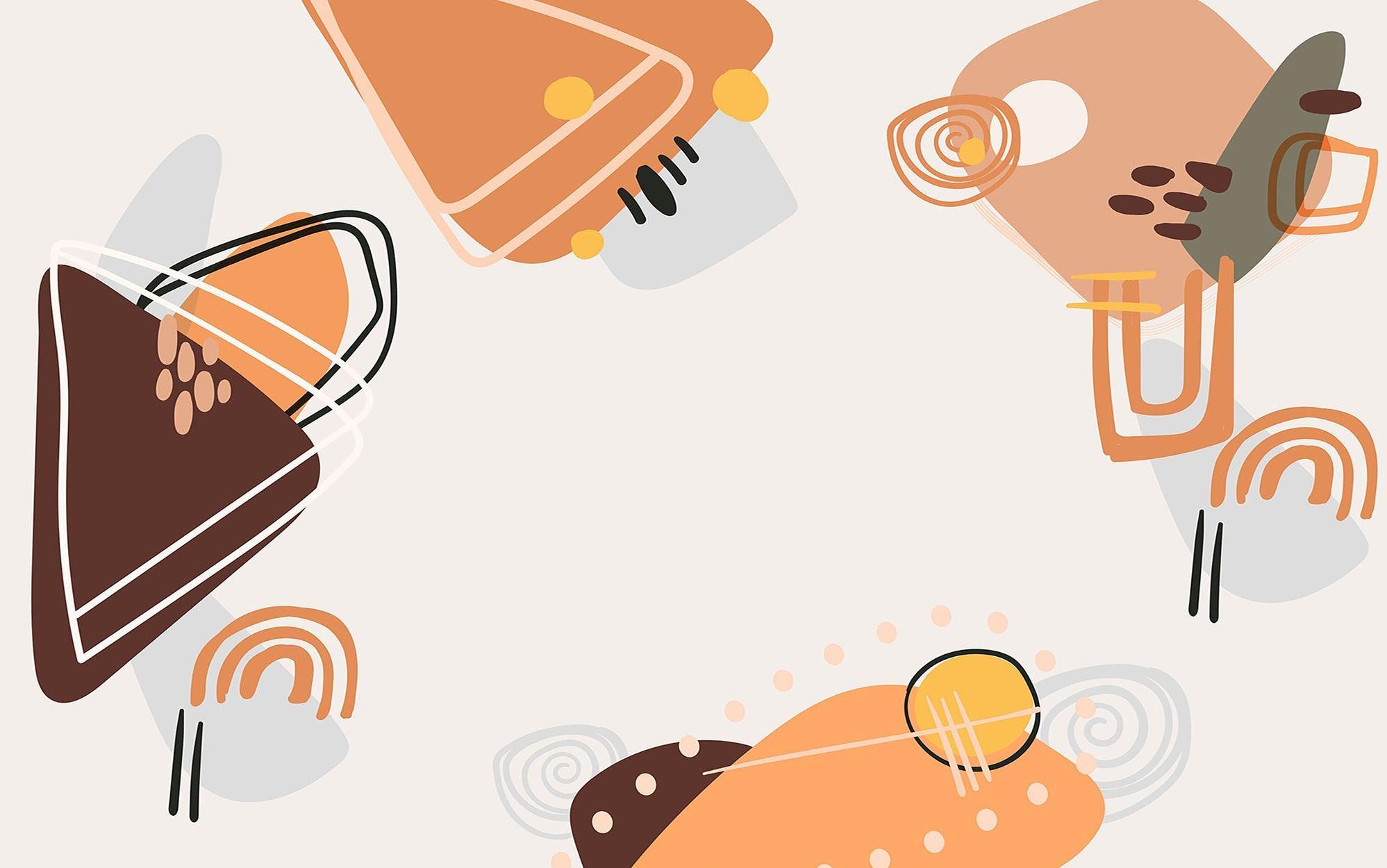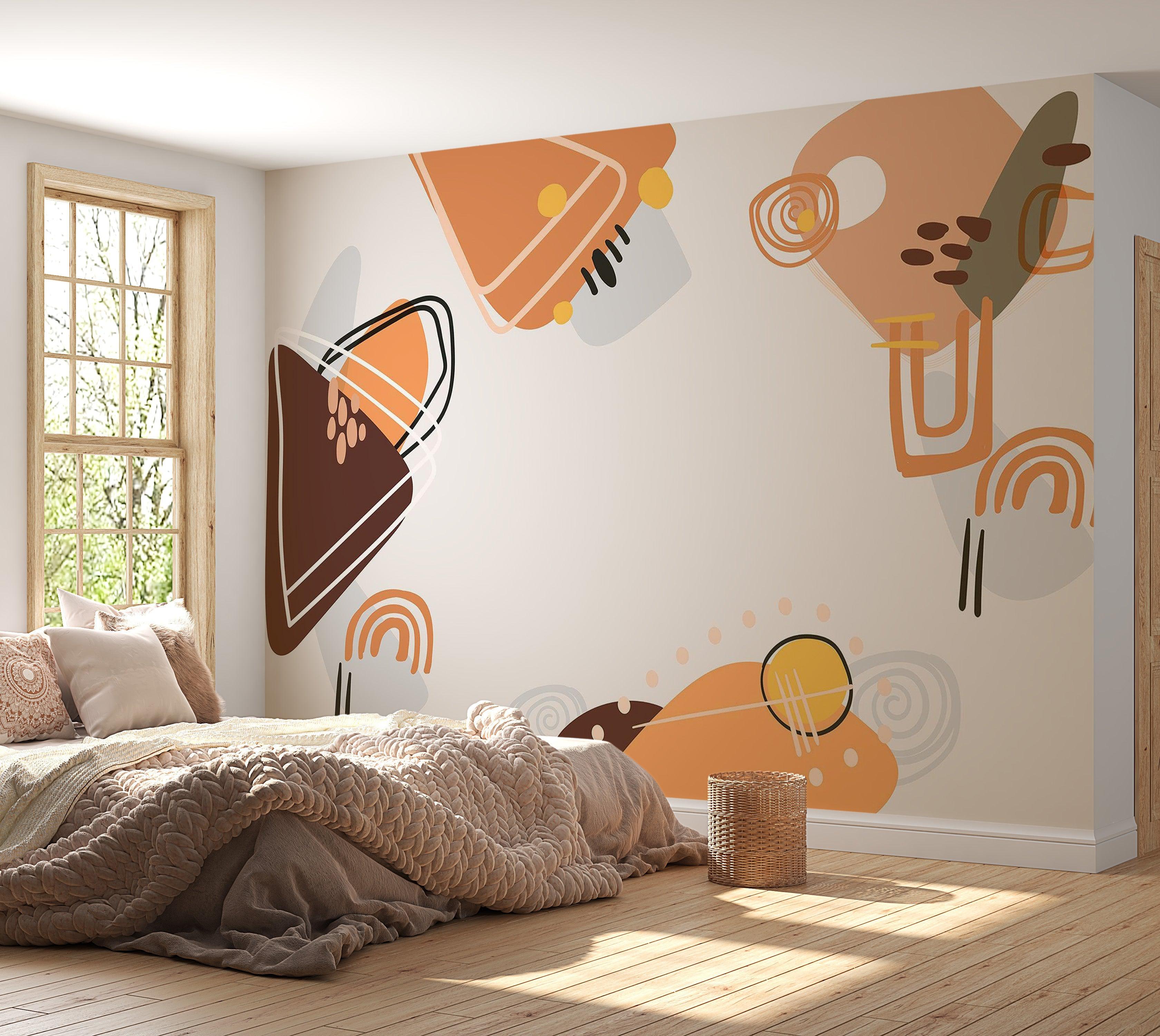 This wallpaper mural presents a modern abstract design featuring geometric shapes and freeform patterns. The color palette includes earthy tones such as browns, oranges, and beiges, combined with simple illustrations of light bulbs, creating a playful yet sophisticated ambiance.